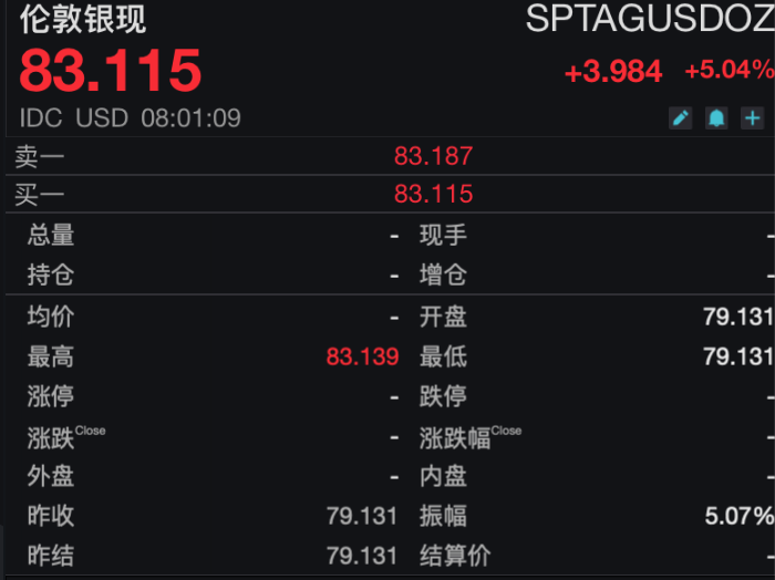 【大河财立方消息】2月3日,现货黄金、现货白银终止三连跌。截至发稿,伦敦金现上涨2.67%,逼近4800美元,报4783.730美元/盎司;伦敦银现上涨5.04%,报83.115美元/盎司。