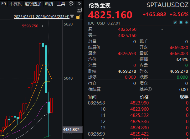 【大河财立方消息】2月3日,现货黄金终止三连跌,重回4800美元/盎司,涨幅3.56%,报4825.16美元/盎司。