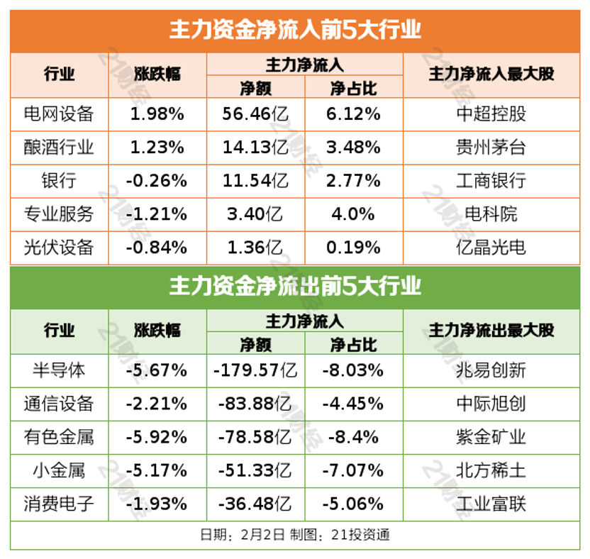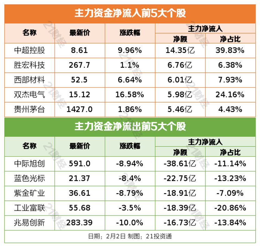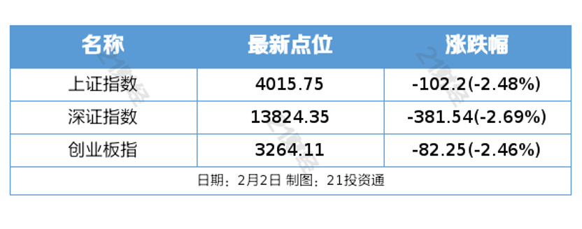 2月2日,市场全天震荡调整,三大指数均跌超2%,科创50指数跌超3%。截至收盘,沪指跌2.48%,深成指跌2.69%,创业板指跌2.46%。沪深两市成交额2.58万亿,较上一个交易日缩量2508亿。