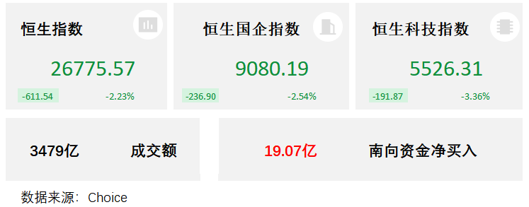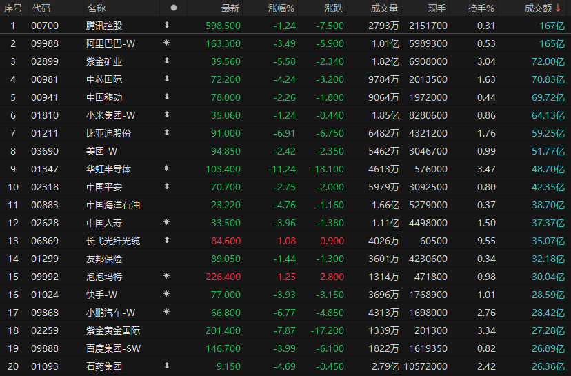 2月2日,贵金属雪崩触发全球金融市场暴跌,港股三大指数再度大幅下跌。恒指一度跌至3.2%,最终收跌2.23%重挫逾600点报26775点;国指跌2.54%,恒科指盘中一度大跌4.3%,收跌3.36%并且录得3连跌行情。南向资金今日净买入港股19.07亿港元。南向资金今日成交额1382.85亿港元,港股大市成交3478.86亿港元。南向十大成交股中,腾讯控股、小米集团-W、中国人寿分别获净买入13.04亿港元、2.78亿港元、1.88亿港元。华虹半导体、紫金矿业、石药集团分别遭净卖出6.15亿港元、4.64亿港元、3.93亿港元。