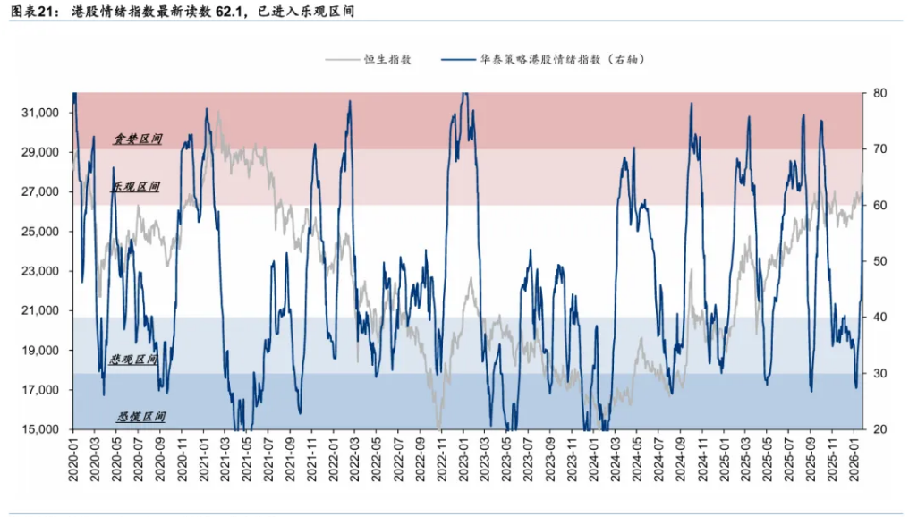 情绪指标升至乐观区间,短线波动风险积累。截至周五港股情绪指数最新读数62.1,较前一周继续回升,已进入乐观区间。归因来看,代表南向资金情绪的净流入、买入强度及AH溢价得分维持高位;衍生品指标方面,恒指升贴水单项已修复至70上方,看沽看购持仓比周四达1.98创2006年以来新高,对应衍生品情绪触及80附近水平(前一周五为35),或对应期权市场参与者Sell Put以期待获取权利金收益或以较低价格构建仓位。