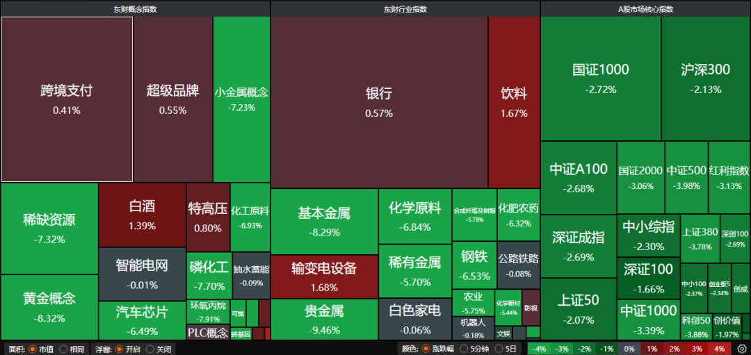 A股三大指数昨日集体大跌,沪指跌2.48%,深证成指跌2.69%,创业板指跌2.46%。沪深京三市成交额超过2.6万亿。行业板块几乎全线下跌,贵金属、采掘行业、化肥行业、煤炭行业、有色金属、半导体、钢铁行业重挫,仅电网设备与酿酒行业逆市走强。