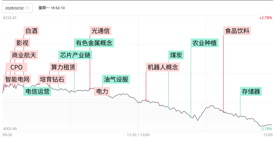 财联社2月3日电,上个交易日市场全天震荡调整,三大指数均跌超2%,科创50指数跌超3%。全市场超4600只个股下跌,其中123只个股跌停。沪深两市成交额2.58万亿,较上周五缩量2508亿。1)据央视财经报道,在广东、江苏等地调研发现,大量变压器工厂已经处于满产的状态。电网设备股全天展开凌厉涨势,白云电器、三变科技、大连电瓷、广电电气等十余股涨停,双杰电气、中国西电等一度触及涨停。2)2月1日,腾讯元宝上线春节红包活动,当日腾讯元宝App升至苹果商店免费App第一名。腾讯云为代表的算力租赁产业链继续逆势走强,利通电子、群兴玩具封涨停,亚康股份一度触及20厘米涨停。相比算力租赁概念的持续活跃,AI应用端的修复力度不尽人意,浙文互联、利欧股份等前期人气股纷纷走出冲高回落行情,且上周末公告控股股东减持的蓝色光标尾盘跳水跌超8%。3)据不完全统计,多家光模块上市公司披露了2025年度业绩预告,光通信产业链早盘再度逆势活跃,新易盛一度涨超10%,长飞光纤触及涨停,均续创历史新高。但受到存储芯片为首的半导体产业链持续走弱拖累,算力硬件股此后持续回落,新易盛收窄涨幅至不足5%,中际旭创早盘短暂冲高后持续走低,最终跌近9%。4)财联社记者从渠道人士处获悉,春节旺季需求向好,飞天茅台(53度、500ml)全国多地供应偏紧,白酒板块摆脱上周五调整分化卷土重来,皇台酒业晋级3连板,金徽酒午后反包涨停,贵州茅台盘中一度涨超4%。