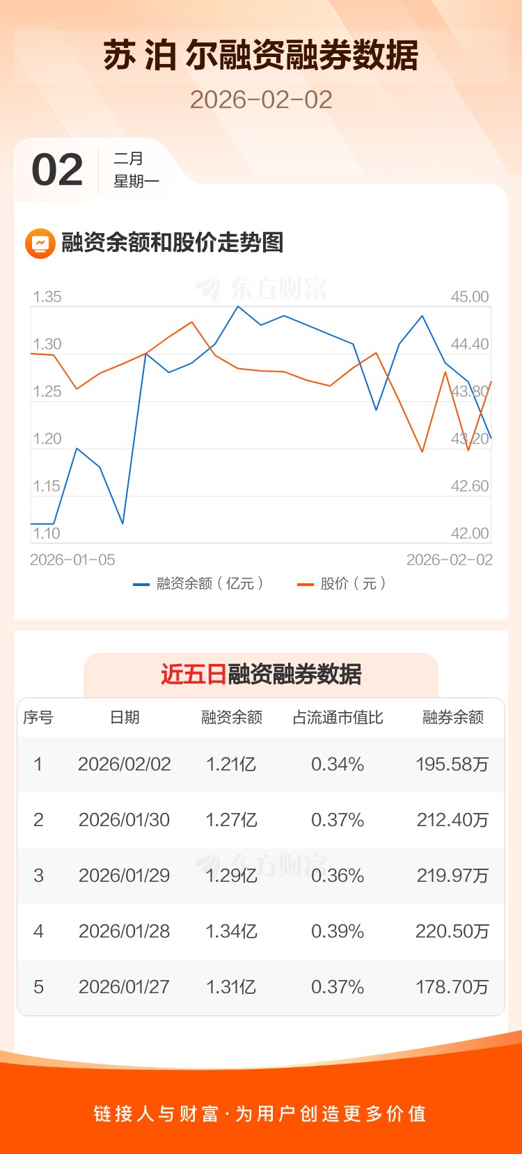 交易所最新数据显示,苏 泊 尔于2026年2月2日获融资买入801.57万元,融资偿还1317.53万元,当日融资净偿还515.96万元。目前,该股融资余额1.21亿,占流通市值比例为0.34%。