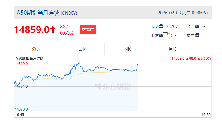 上证报中国证券网讯 2月3日,富时中国A50指数期货在上一个交易日夜盘收涨0.46%的基础上高开。截至9时06分,主力合约涨0.6%。