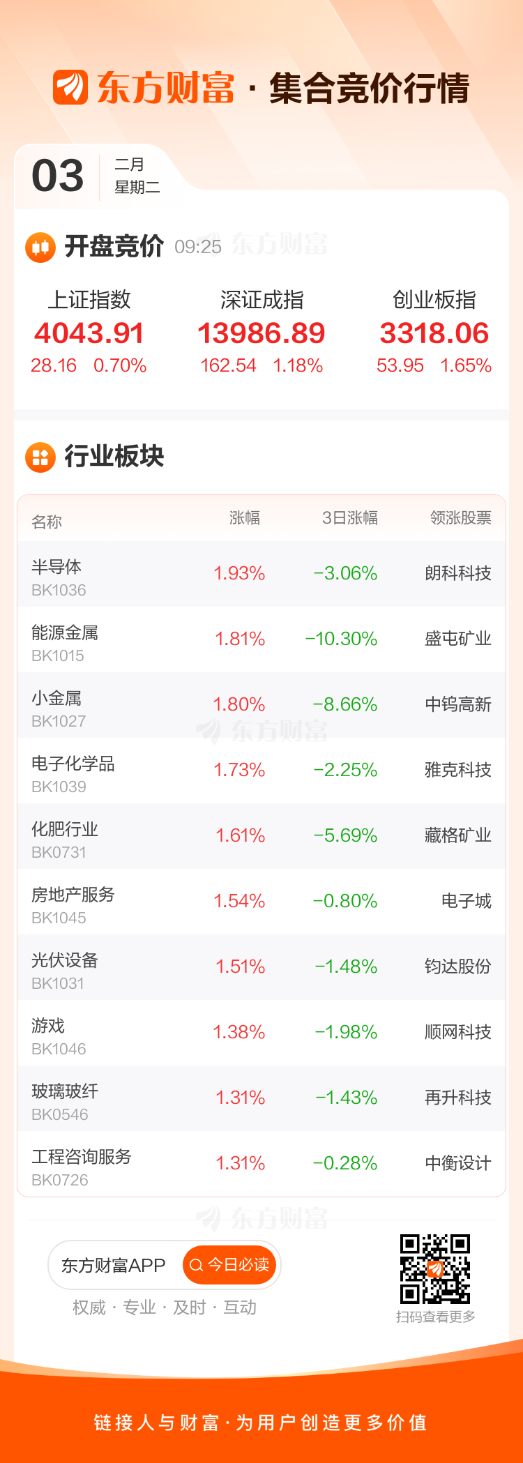 2月3日,三大指数集体高开,上证指数高开0.7%,深证成指高开1.18%,创业板指高开1.65%。板块方面,半导体领涨,朗科科技涨7.18%,能源金属、小金属等开盘涨幅居前。