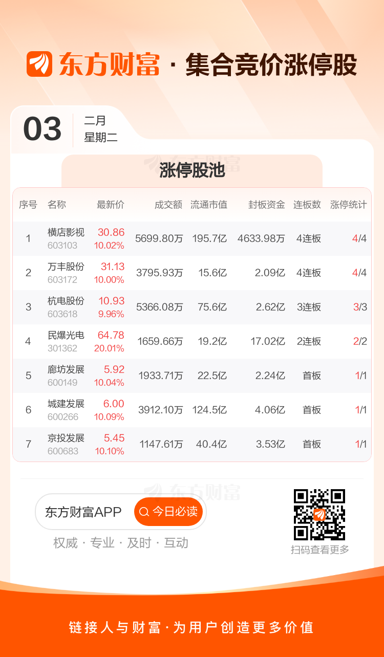 2月3日集合竞价:横店影视、万丰股份4连板