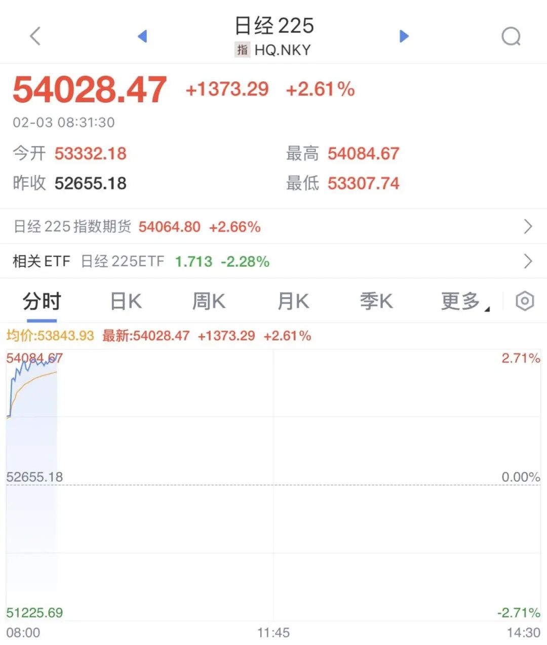此外,日本股市同样走高,日经225指数早盘直线拉升,现涨超2.6%。