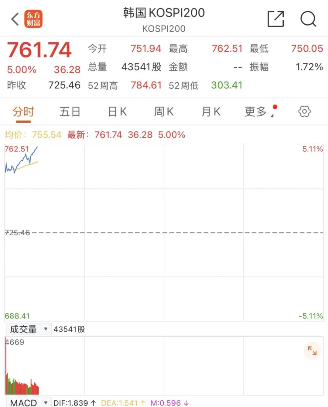 因韩国KOSPI 200期货上涨5%,韩国交易所对韩国综合股价指数启动“SIDECAR机制”,程序化交易暂停5分钟。