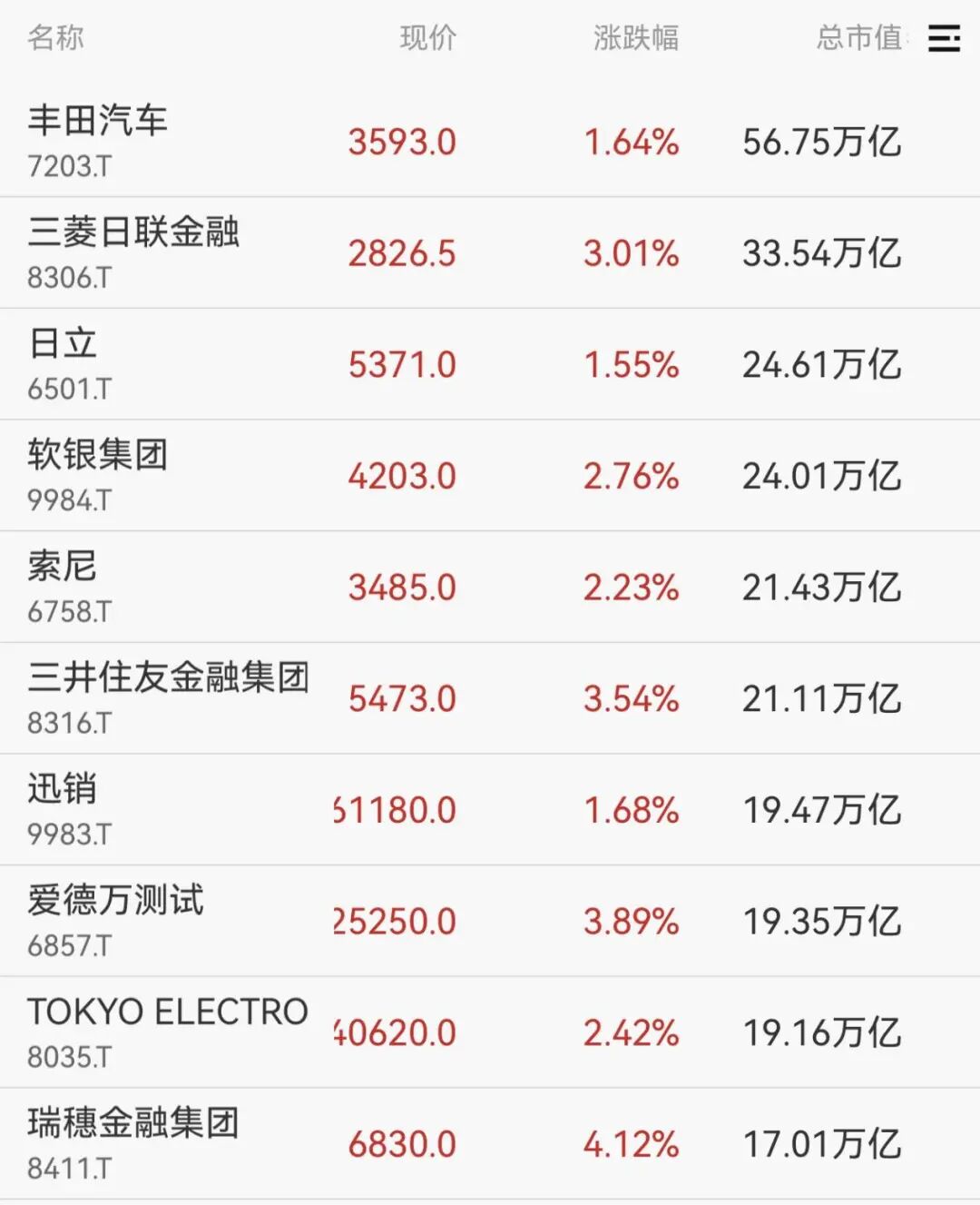 权重股方面,金融、科技概念股走高,三菱日联金融、三井住友金融集团、瑞穗金融集团等均涨超3%。