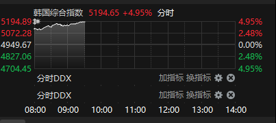 上证报中国证券网讯 2月3日,韩国综合指数持续走高,截至9时31分,指数涨近5%。