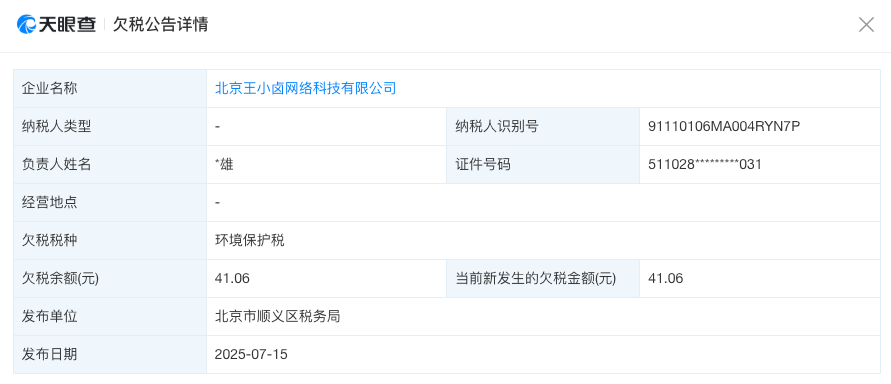 除去产品端的显性危机,王小卤在经营层面的合规问题同样值得关注。天眼查数据显示,其运营主体北京王小卤网络科技有限公司,2024年6月因涉及3.8万元案件被列为被执行人,2025年7月又因欠缴环境保护税41.1元被税务部门公示。