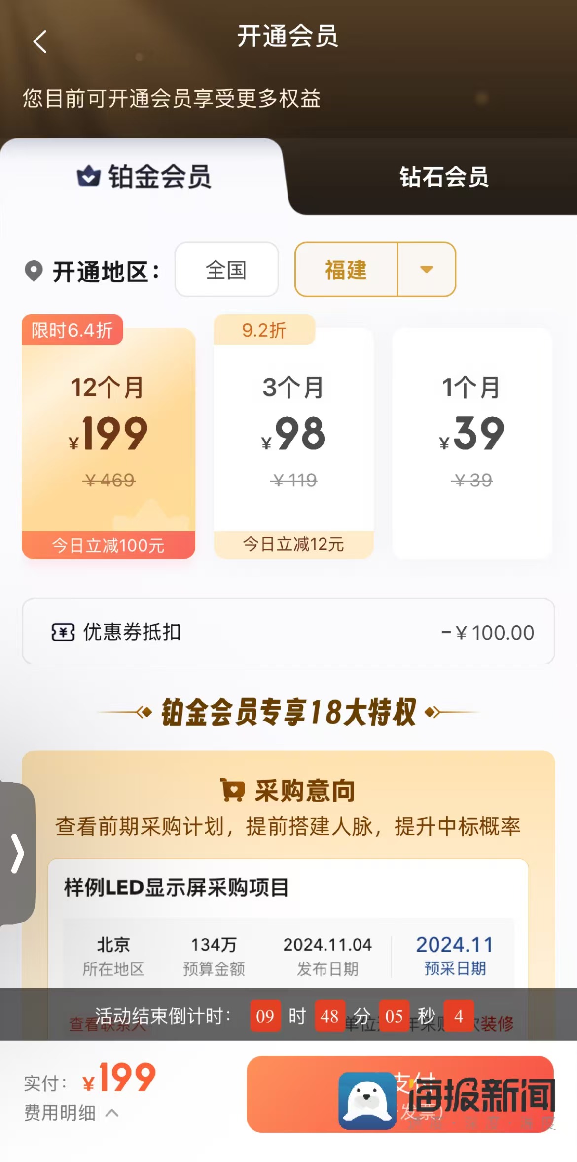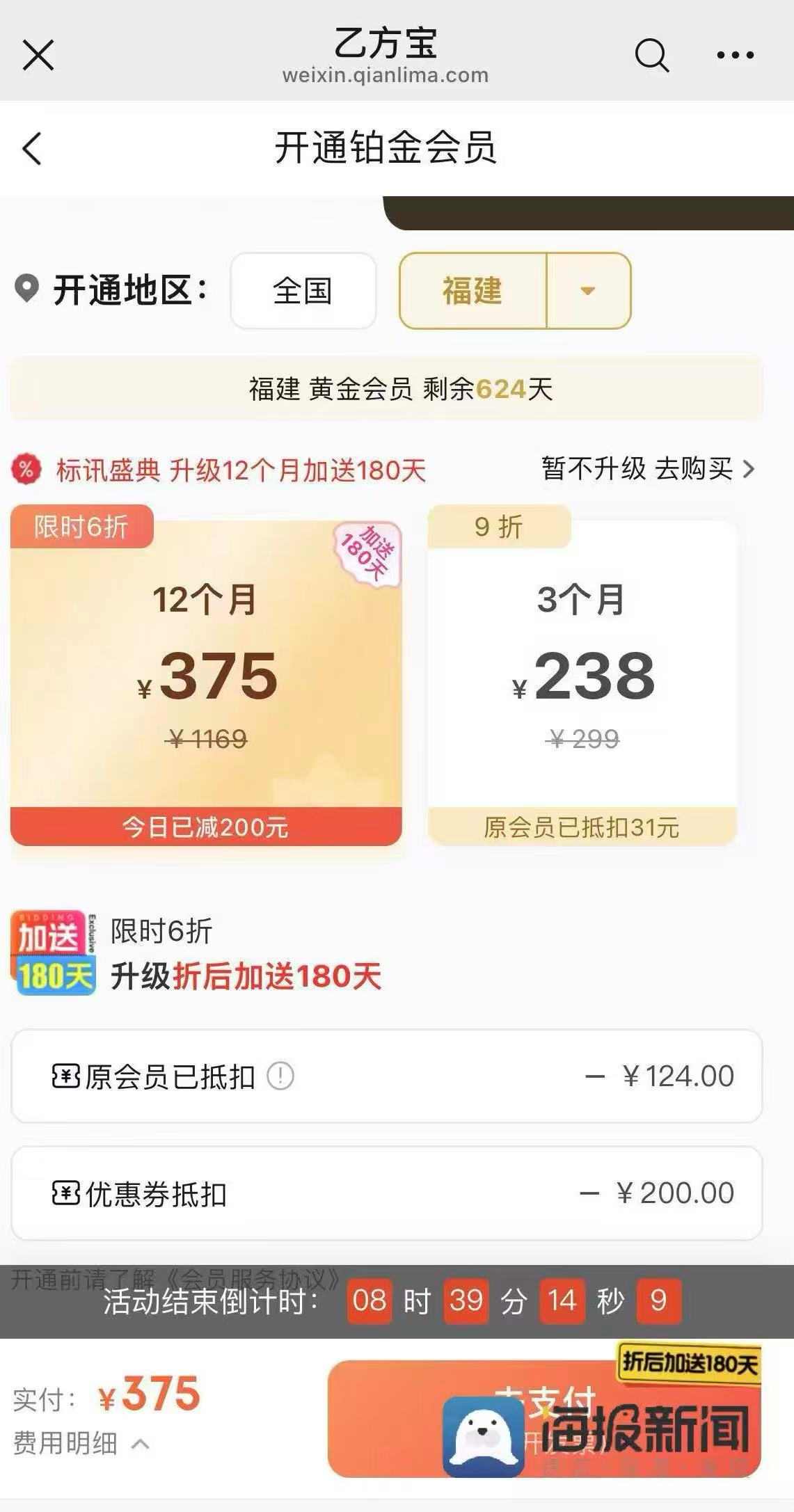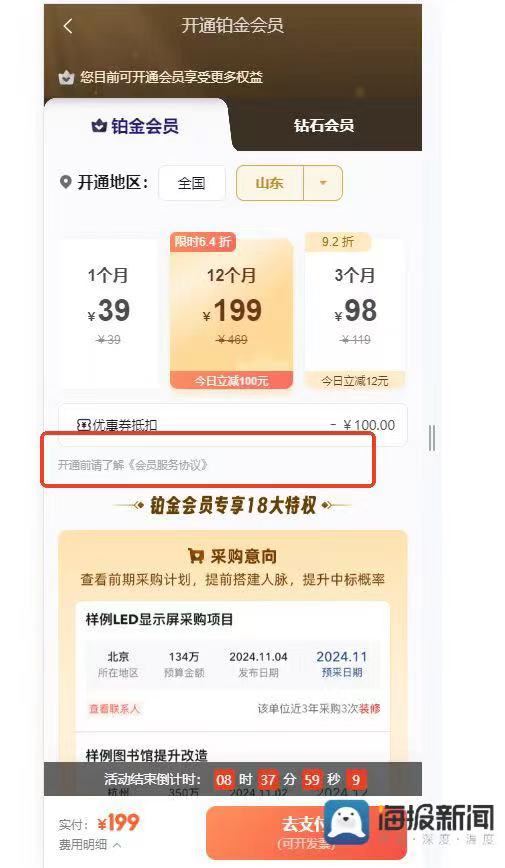 近日,福建市民吴先生向海报新闻记者反映,其常用的乙方宝(北京千里马网信科技有限公司旗下的招标采购信息网平台)“杀熟”。此前,他花199元开通黄金会员,现升级铂金会员需375元且仅送半年;而新会员直接开通铂金会员仅199元,买一年送一年,吴先生认为此举不合理。