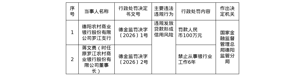 罚单显示,德阳农村商业银行股份有限公司罗江支行的主要违法违规事实(案由)为:违规发放贷款形成信用风险。