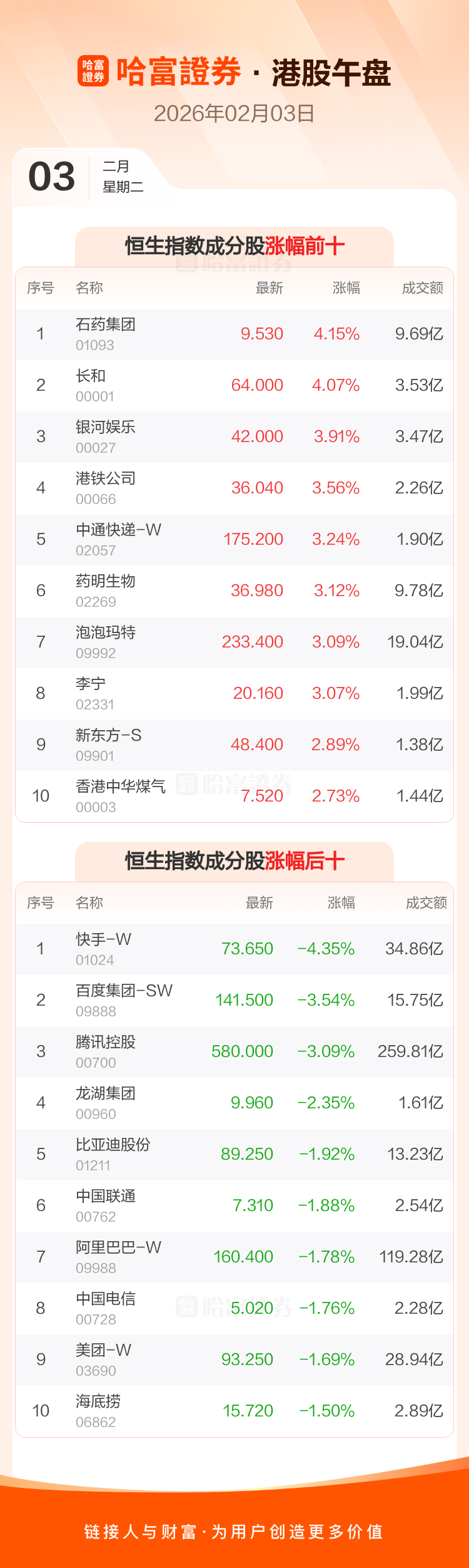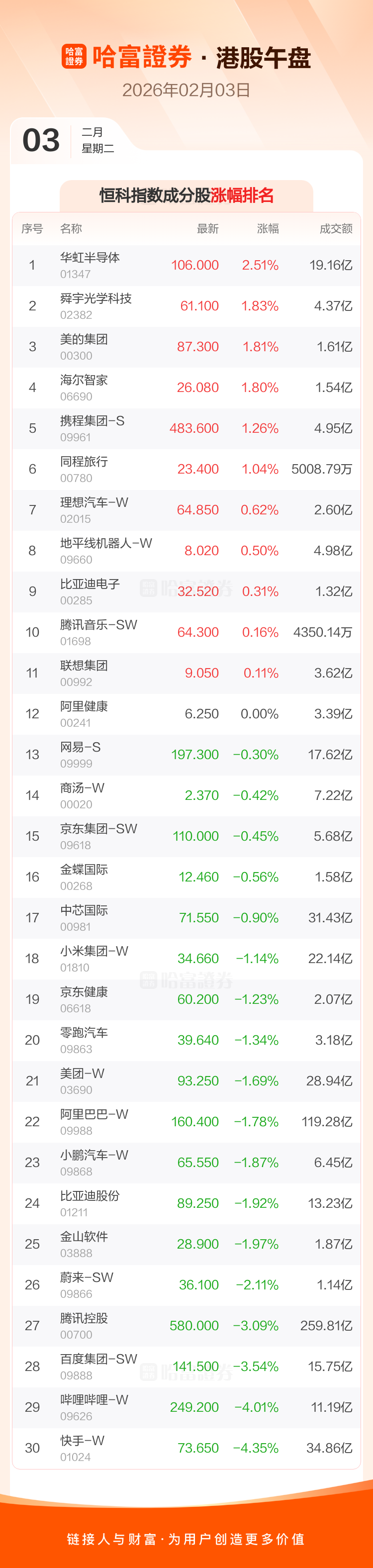 港股2月3日午盘走高,恒生指数收报26830.5点,涨54.93点,涨幅0.21%;恒生科技指数收报5453.68点,跌72.63点,跌幅1.31%。恒生指数成分股中石药集团、长和、银河娱乐涨幅居前,快手-W、百度集团-SW、腾讯控股跌幅靠前。恒生科技指数成分股中华虹半导体、舜宇光学科技、美的集团涨幅居前,快手-W、哔哩哔哩-W、百度集团-SW跌幅靠前。