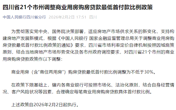 在政策下限基础上,辖内各商业银行可按照市场化、法治化原则,结合自身经营情况、客户风险状况等因素,合理确定每笔商业用房购房贷款具体首付款比例。上述政策自2026年2月2日起执行。