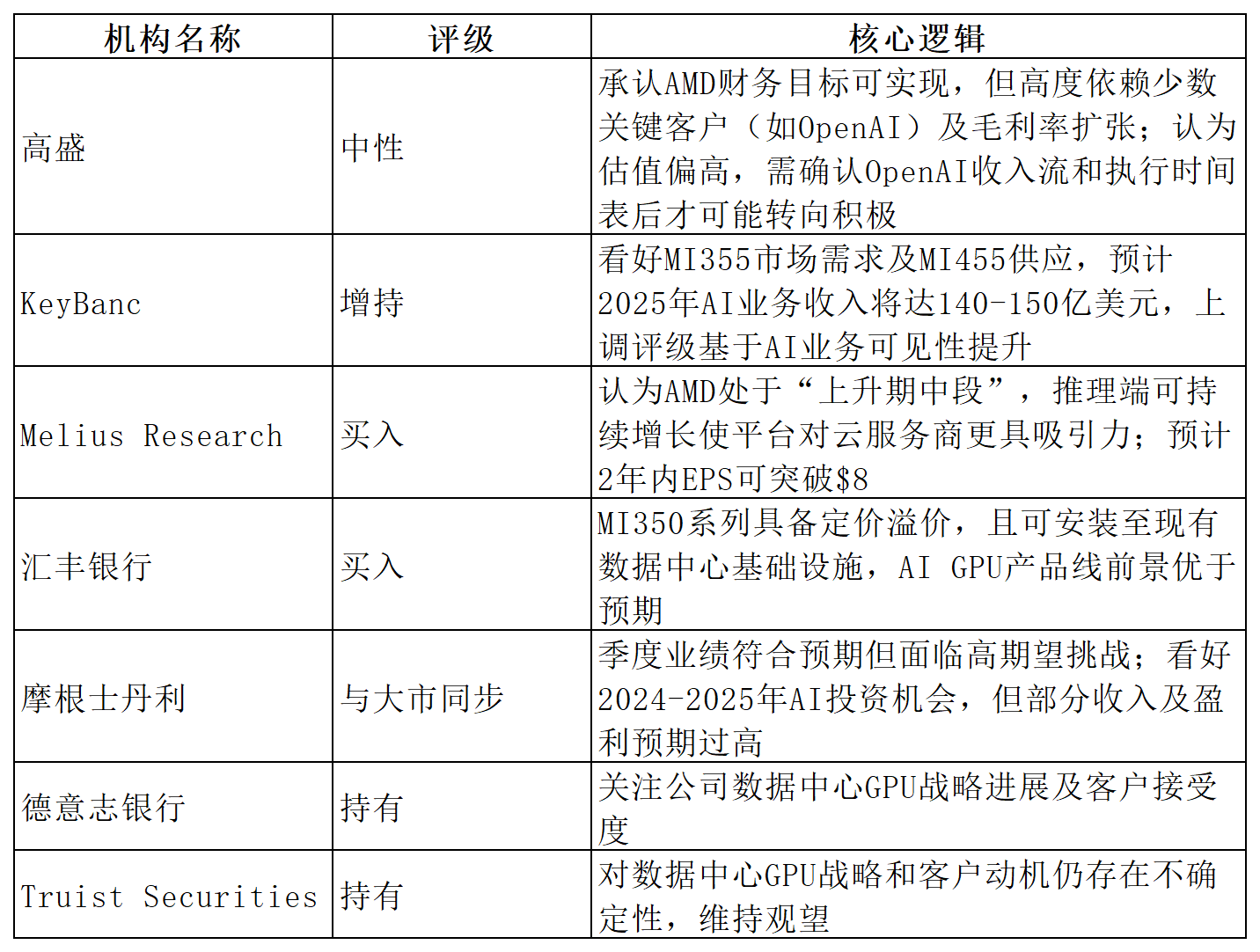主流机构普遍看好AMD在AI领域的增长前景,但对估值和客户集中度存有分歧。乐观方关注其产品需求和收入能见度;谨慎方则认为高预期已反映在股价中,需验证实际业绩。