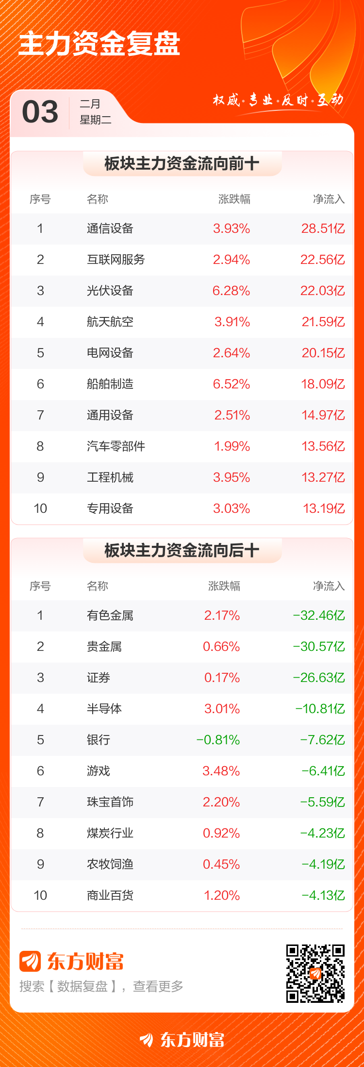 2月3日,沪指涨1.29%,深成指涨2.19%,创业板指涨1.86%。两市成交额2.54万亿,较上个交易日缩量405亿。数据显示,今日大盘主力资金净流入144.00亿。通信设备、互联网服务、光伏设备等板块主力资金流入排名居前,其中通信设备净流入28.51亿元。