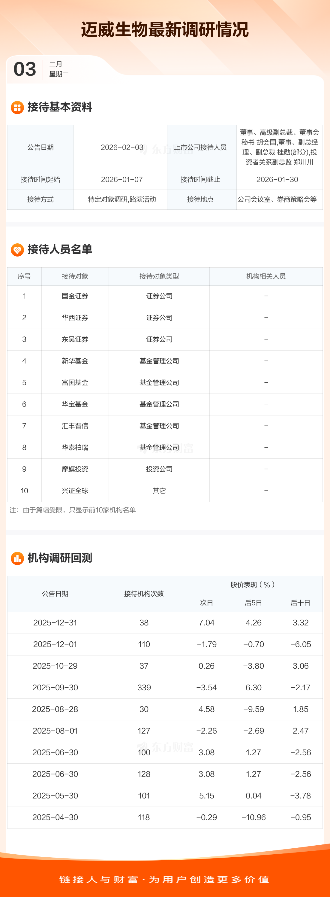 迈威生物2月3日公告称,1月7日至1月30日接待国金证券等66家机构调研。接待人员包括董事、高级副总裁、董事会秘书 胡会国,董事、副总经理、副总裁 桂勋(部分),投资者关系副总监 郑川川。