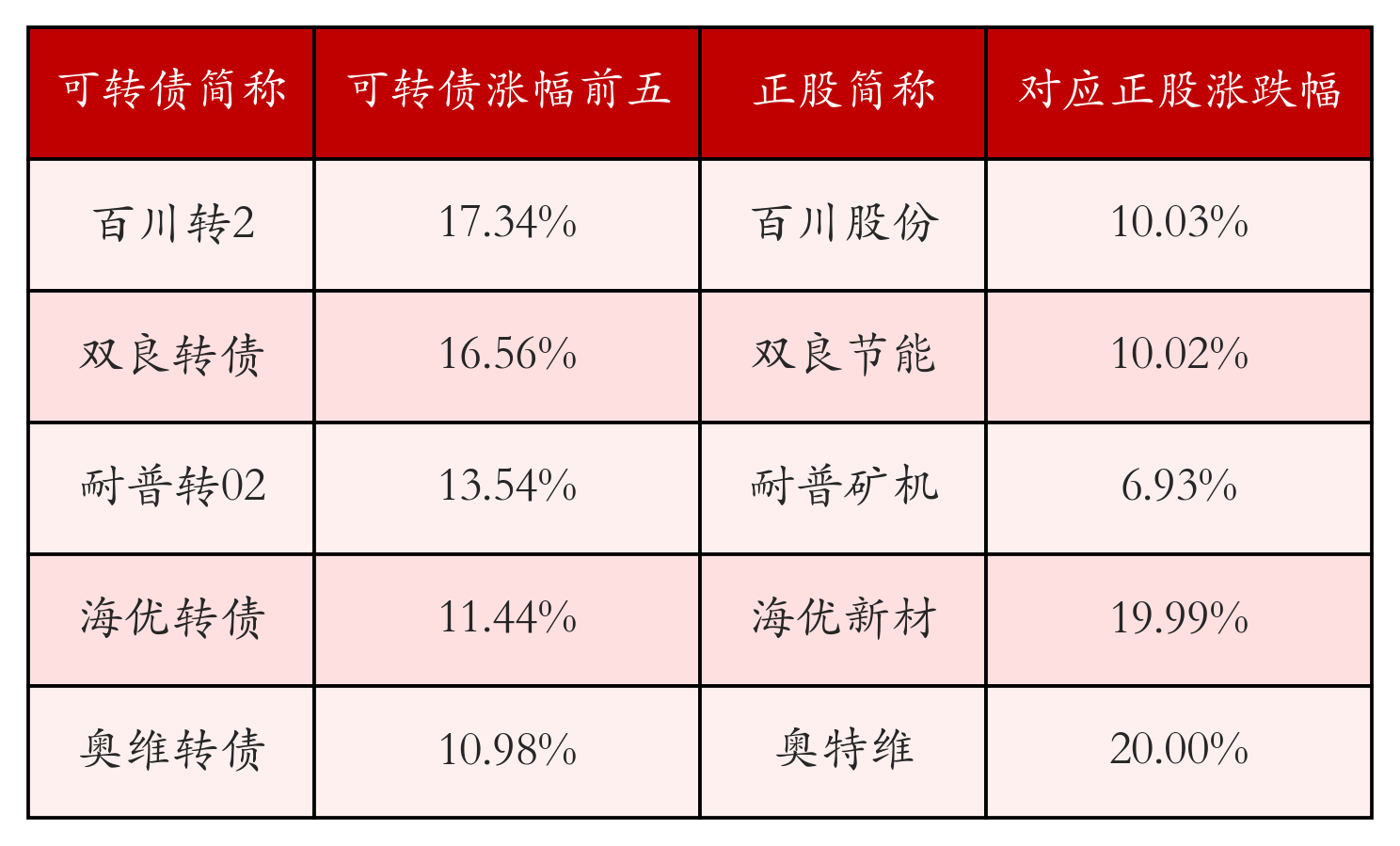 南财智讯2月3日电,盘后数据显示,债市方面,中证转债指数收涨2.63%,报521.46,成交额为924.42亿元。可转债方面,今日共成交373只可转债,其中360只收涨,0只收平,13只收跌。具体来看,222只可转债涨幅超过2%。其中百川转2(127075)涨17.34%,双良转债(110095)涨16.56%,耐普转02(123265)涨13.54%。今日有1只可转债跌幅超2%,华安转债(110067)跌4.85%,上银转债(113042)跌0.76%,中环转2(123146)跌0.57%。存在交易量的可转债所对应的正股中,338只收涨,5只收平,30只收跌。具体来看,53只可转债对应正股涨幅超过5%,其中,奥特维(688516)涨停,收涨20.0%;海优新材(688680)涨停,收涨19.99%。同时所对应的可转债:奥维转债(118042)同涨10.98%;海优转债(118008)同涨11.44%。今日有2只可转债对应正股跌幅超过5%,没有正股跌停。