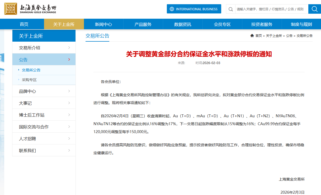 同日,上海黄金交易所发布关于调整黄金部分合约保证金水平和涨跌停板的通知,自2026年2月4日(星期三)收盘清算时起,Au(T+D)、mAu(T+D)、Au(T+N1)、Au(T+N2)、NYAuTN06、NYAuTN12等合约的保证金比例从16%调整为17%,下一交易日起涨跌幅度限制从15%调整为16%;CAu99.99合约保证金每手120,000元调整至每手150,000元。