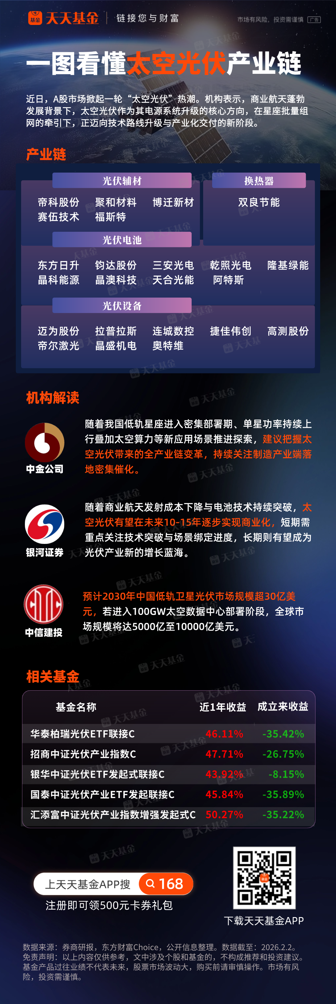 中金公司指出,商业航天蓬勃发展背景下,太空光伏作为其电源系统升级的核心方向,在星座批量组网的牵引下正迈向技术路线升级与产业化交付的新阶段。随着我国低轨星座进入密集部署期、单星功率持续上行叠加太空算力等新应用场景推进探索,建议把握太空光伏带来的全产业链变革,持续关注制造产业端落地密集催化。