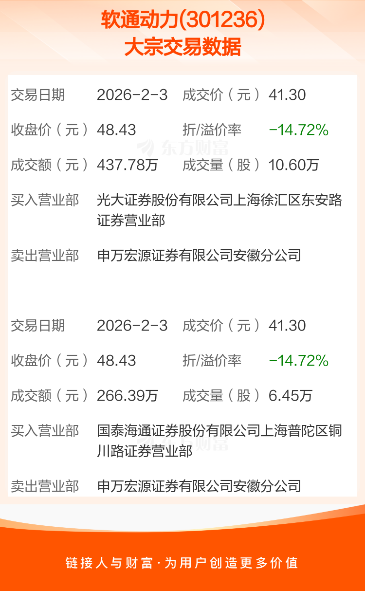 2026年2月3日,软通动力发生2笔大宗交易,共成交17.05万股,成交金额704.17万元,占其流通市值比例为0.02%。