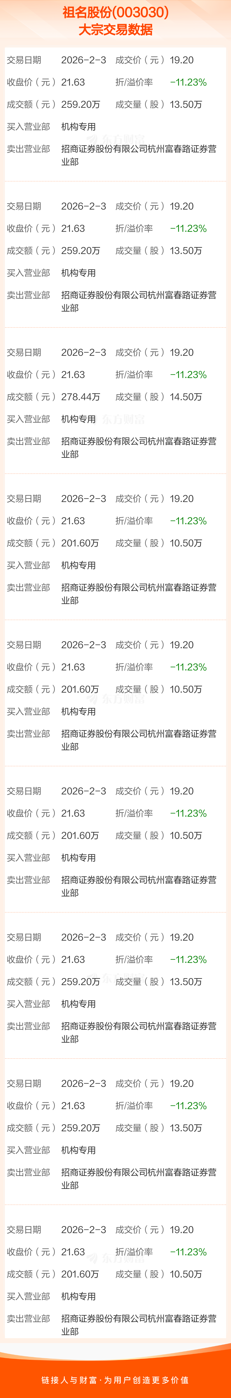 大宗交易:祖名股份成交2121.64万元,折价11.23%(2-3)