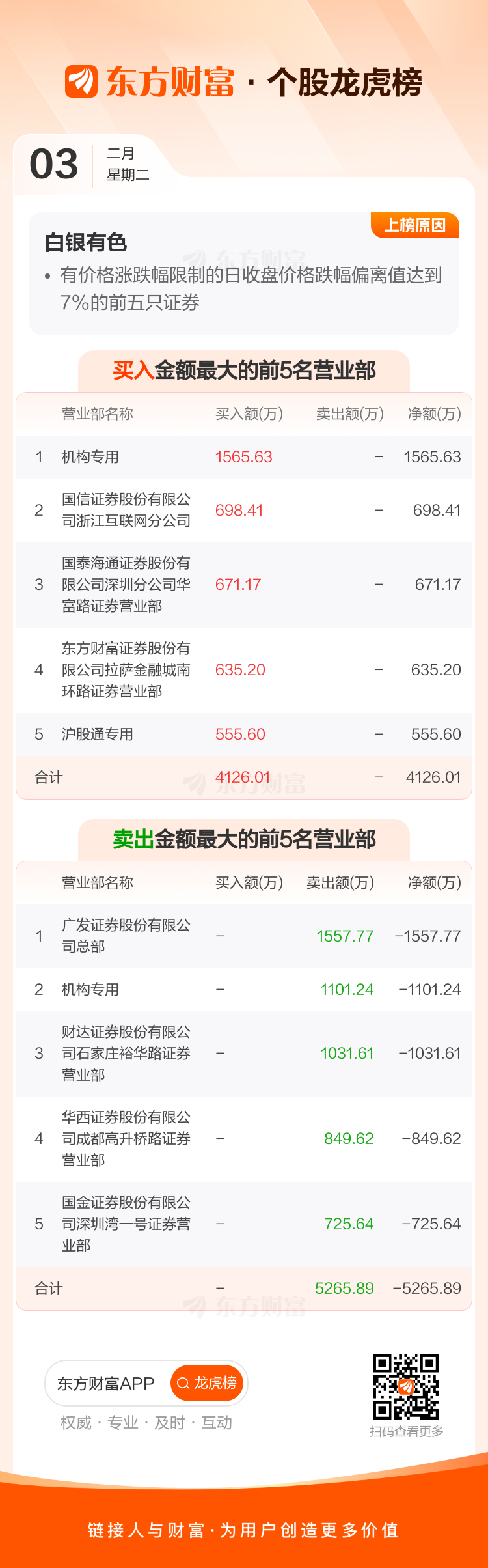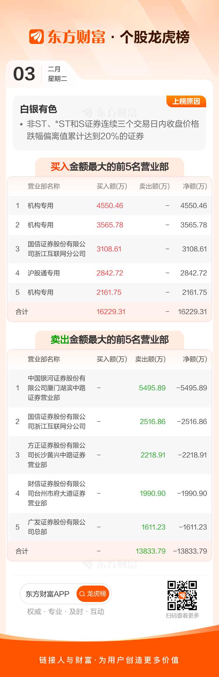 交易所2026年2月3日公布的交易公开信息显示,白银有色因成为有价格涨跌幅限制的日收盘价格跌幅偏离值达到7%的前五只证券、非ST、*ST和S证券连续三个交易日内收盘价格跌幅偏离值累计达到20%的证券上榜。白银有色当日收报11.07元,涨跌幅-10.00%,偏离值-11.30%,换手率0.62%,成交额5.06亿。异常期间1月30日至2月3日,期间涨幅-27.12%,累计偏离值-24.95%,区间成交额18.28亿。