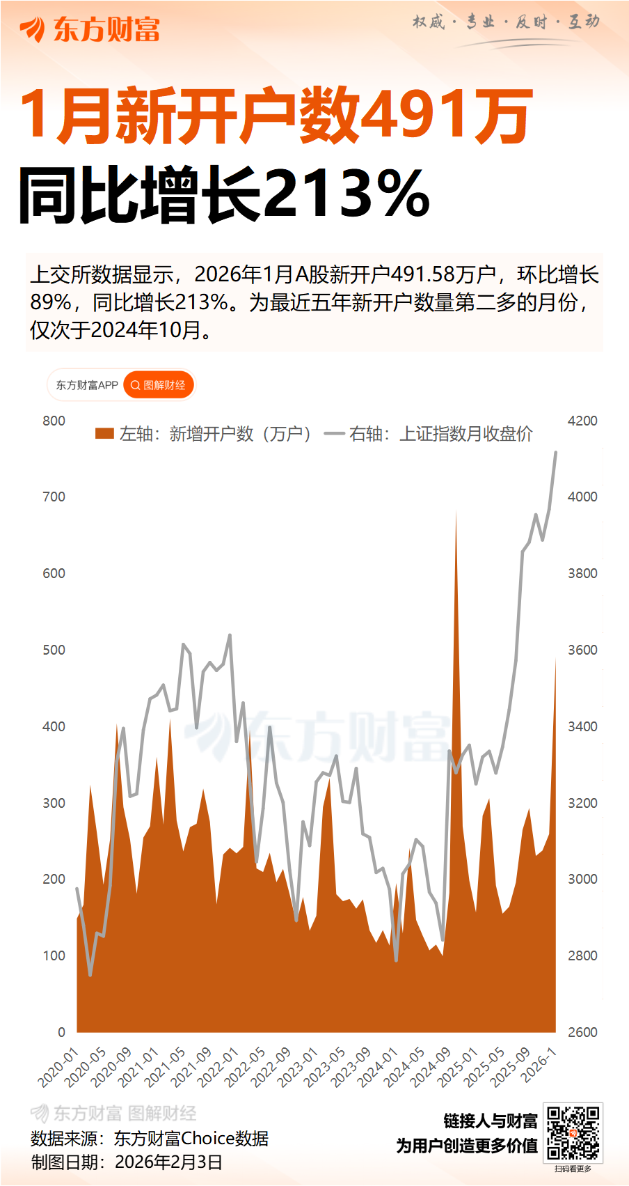 1月新开户数491万 同比大增213%!一图速览近五年开户数与大盘走势