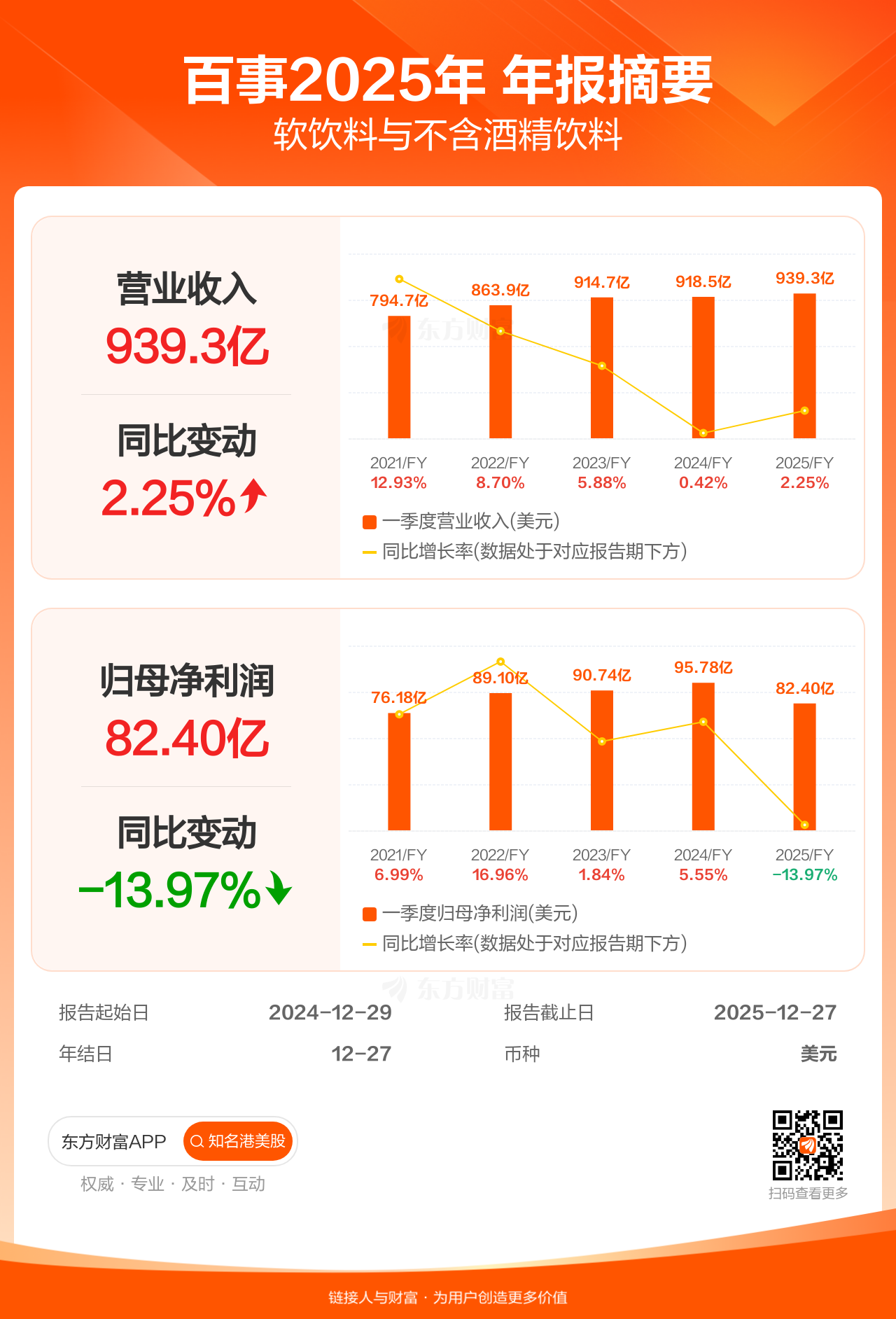 百事2月3日发布年报业绩,截至2025年12月27日的12个月内,该公司营业收入939.25亿美元,同比增长2.25%;公司权益持有人应占溢利(归母净利润)82.40亿美元,同比减少13.97%,低于机构一致预测的118.26亿美元。