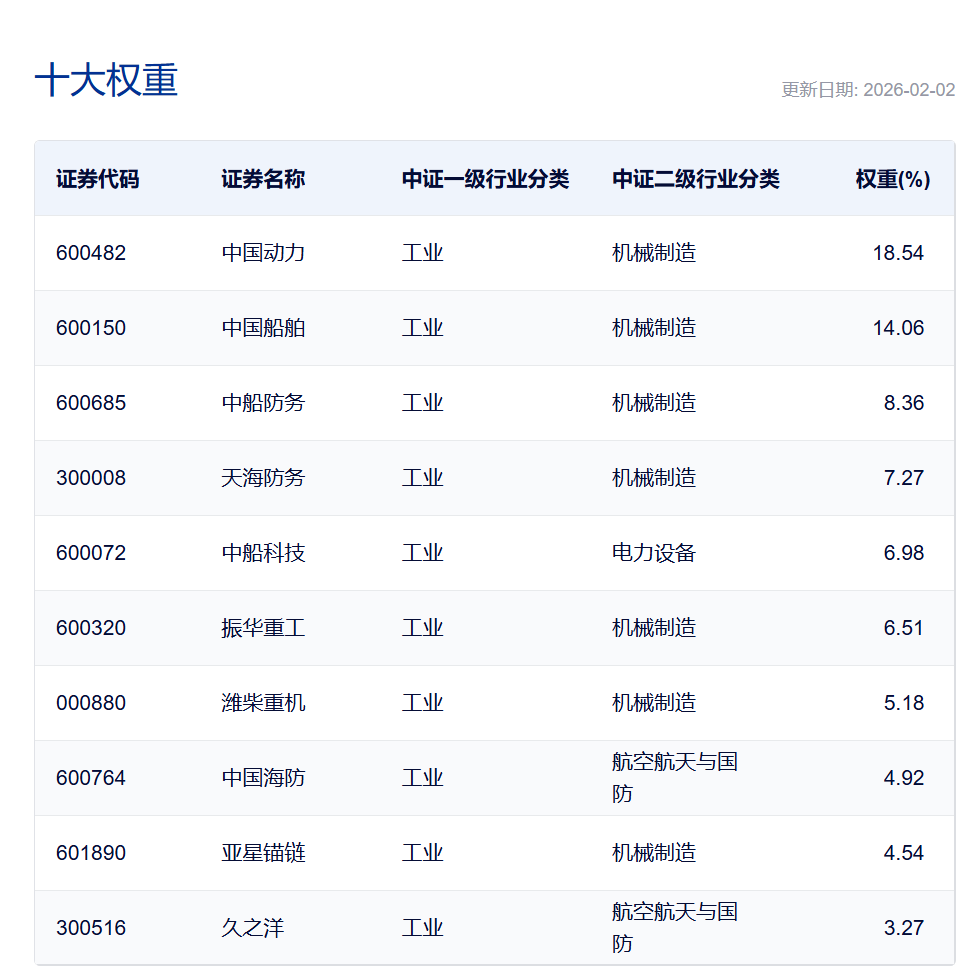 从该ETF前十大权重股来看,截至2月2日,包括中国动力、中国船舶、中船防务、天海防务、中船科技等。