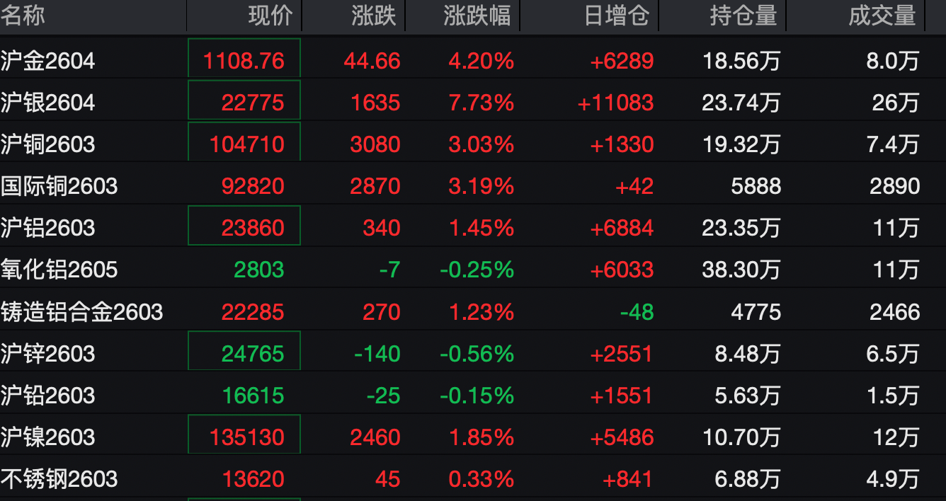 2月3日夜盘,不少国内期货主力合约进入上涨通道,截至发稿,沪金涨超4%,沪银涨超7%,沪铜涨超3%。