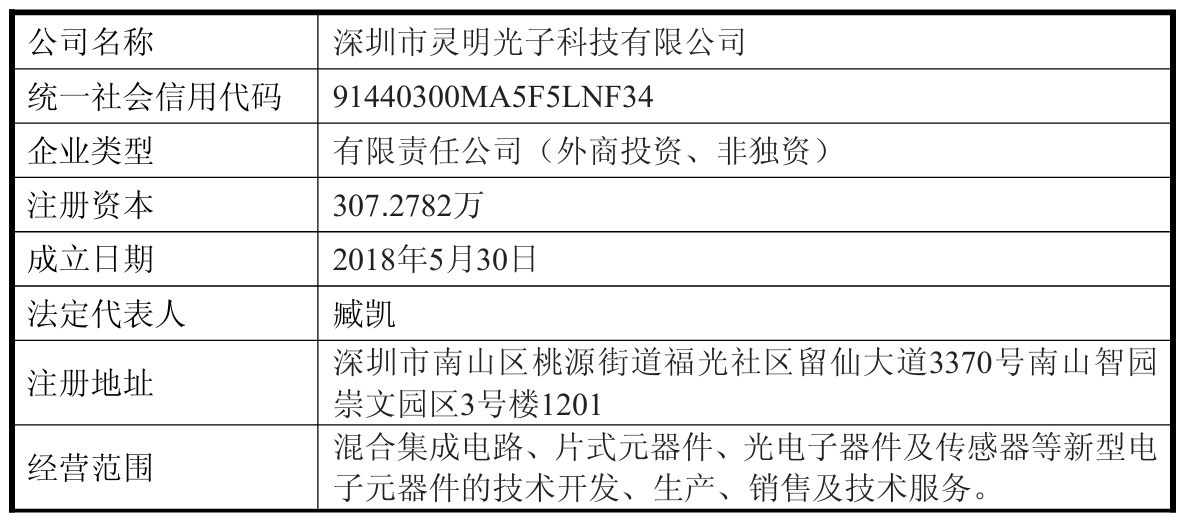 公告介绍,灵明光子成立于2018年5月30日,注册资本307.2782万元,经营范围包括混合集成电路、片式元器件、光电子器件及传感器等新型电子元器件的技术开发、生产、销售及技术服务。