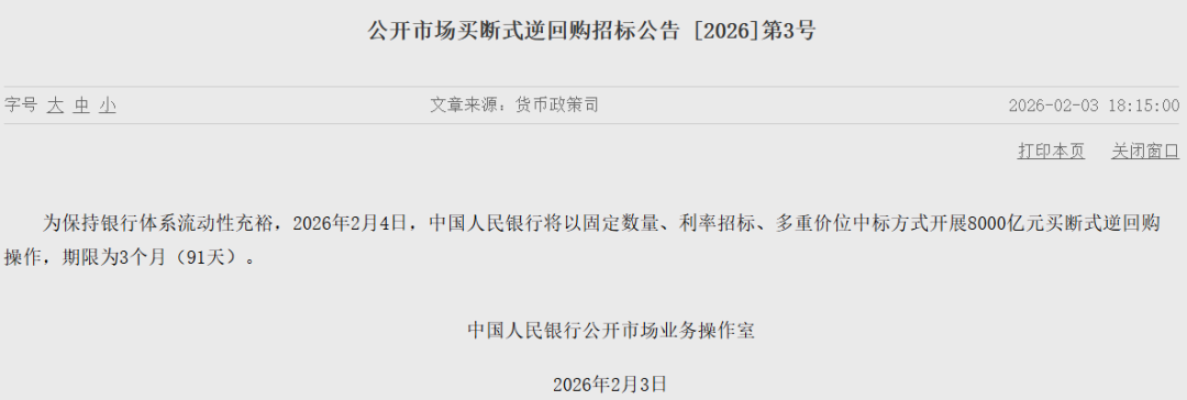 中国人民银行(下称“央行”)2月3日发布公告称,将在2月4日以固定数量、利率招标、多重价位中标方式开展8000亿元买断式逆回购操作,期限为3个月(91天)。鉴于本月有7000亿元买断式逆回购到期,央行本次操作后将实现净投放1000亿元。