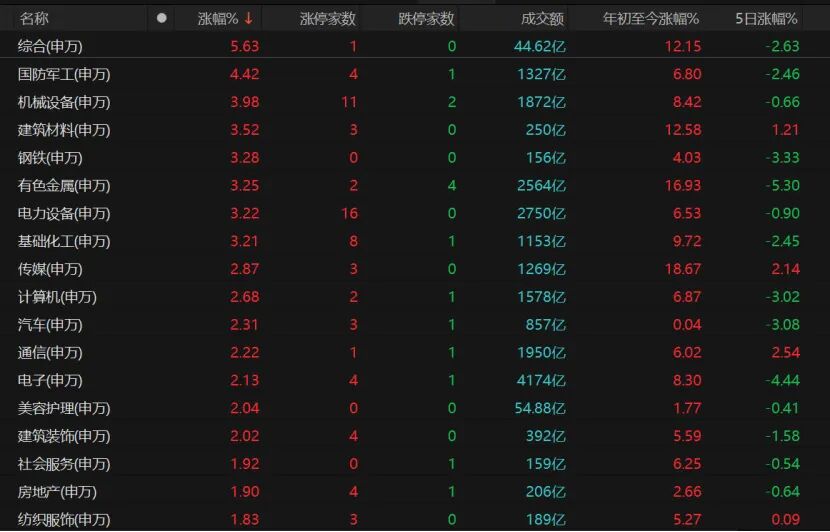 31个申万一级行业中,除了银行微跌,其余均收红,其中24个板块涨幅超过1%。综合板块收涨5.63%,东阳光涨停;国防军工板块涨逾4%,泰豪科技、派克新材、航发控制、航天发展涨停;有色金属、钢铁、基础化工等资源股也表现不错。