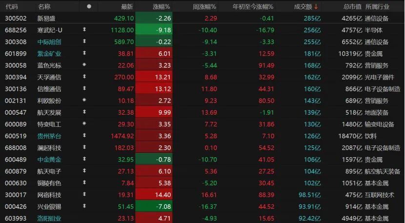 今日市场赚钱效应较好,共计4856只个股收红,83只涨停;532只收跌,跌停股22只。天孚通信收涨13.21%报270元/股,信维通信收涨13.12%报89.47元/股,紫金矿业涨逾6%报38.81元/股。但寒武纪-U跌逾9%报1128元/股,新易盛跌逾2%。