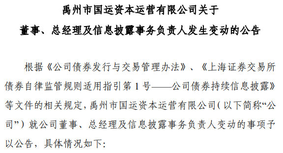 【大河财立方消息】2月3日,禹州市国运资本运营有限公司发布公告称,公司董事、总经理及信息披露事务负责人发生变动。