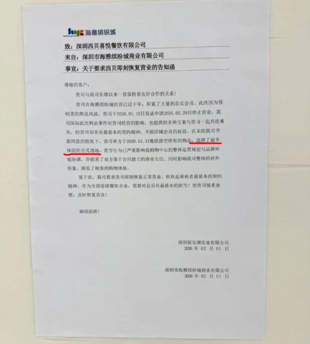 该告知函显示,深圳西贝喜悦餐饮有限公司在海雅缤纷城经营已近十年,积累了大量的忠实会员。此次因为预制菜的舆论风波,该公司于2026年1月15日向商场发函申请2026年2月28日停止营业,商场深知此次舆论事件对该公司经营的影响,也提供多种方案与该公司一起共渡难关。告知函称,“但该公司却舍弃最基本的契约精神,不顾店铺会员的权益,在未经我司书面同意的情况下,贵司单方于2026年1月31日晚欲清空所有的物品,选择了最不体面的方式逃场。”