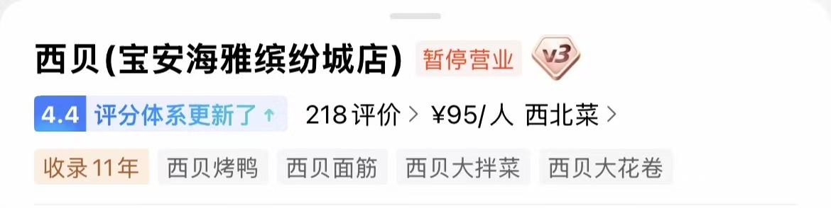 2月3日,21财经·南财快讯记者查询地图软件发现,位于深圳市宝安区的西贝海雅缤纷城店为暂停营业状态。