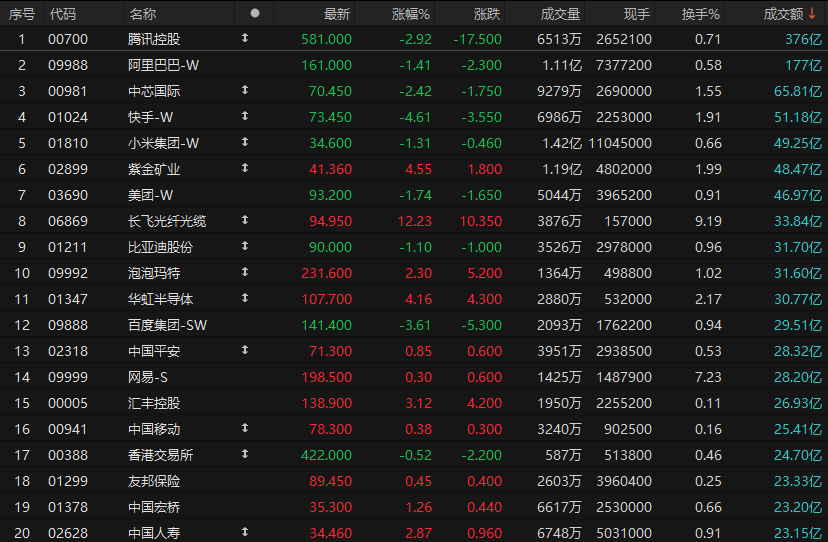 增值税疑云致港股科网股走弱,腾讯爆量成交近350亿港元。市场担忧对游戏、广告等其他互联网增值服务税率调整。截至收盘,快手-W(01024.HK)跌4.61%,百度(09888.HK)跌3.61%,腾讯(00700.HK)跌2.92%,阿里巴巴(09988.HK)跌1.41%。腾讯日内成交近350亿港元,约为过去20个交易日平均成交额的2.5倍。