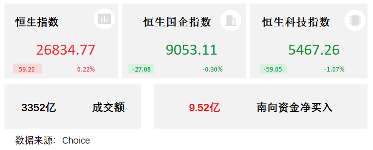 2月3日,港股三大指数走势不一,恒生指数收涨0.22%,国企指数跌0.3%,恒生科技指数跌1.07%。早盘科技股大幅走低拖累三大指数跳水,临近午盘回升午后维持震荡行情。南向资金今日净买入港股19.07亿港元。南向资金今日成交额1382.85亿港元,港股大市成交3478.86亿港元。南向十大成交股中,腾讯控股、小米集团-W、中国人寿分别获净买入13.04亿港元、2.78亿港元、1.88亿港元。华虹半导体、紫金矿业、石药集团分别遭净卖出6.15亿港元、4.64亿港元、3.93亿港元。