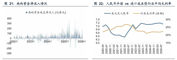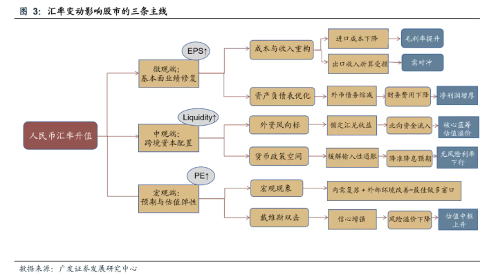 汇率对权益资产的影响主要沿三条链路传导:(1)企业成本损益与盈利弹性:本币升值通过降低以外币计价的进口成本、改善美元负债企业的汇兑损益与财务费用,直接抬升相关行业利润率与ROE;同时对出口导向型企业形成一定结汇与竞争力压力。(2)资金流动与资产比价:升值预期提高外资配置本币资产的风险收益比并对冲汇兑风险,往往带来北向资金等跨境资本净流入。(3)宏观预期与风险偏好:强势汇率常被视为基本面改善与外部环境友好(海外流动性宽松)的综合信号。