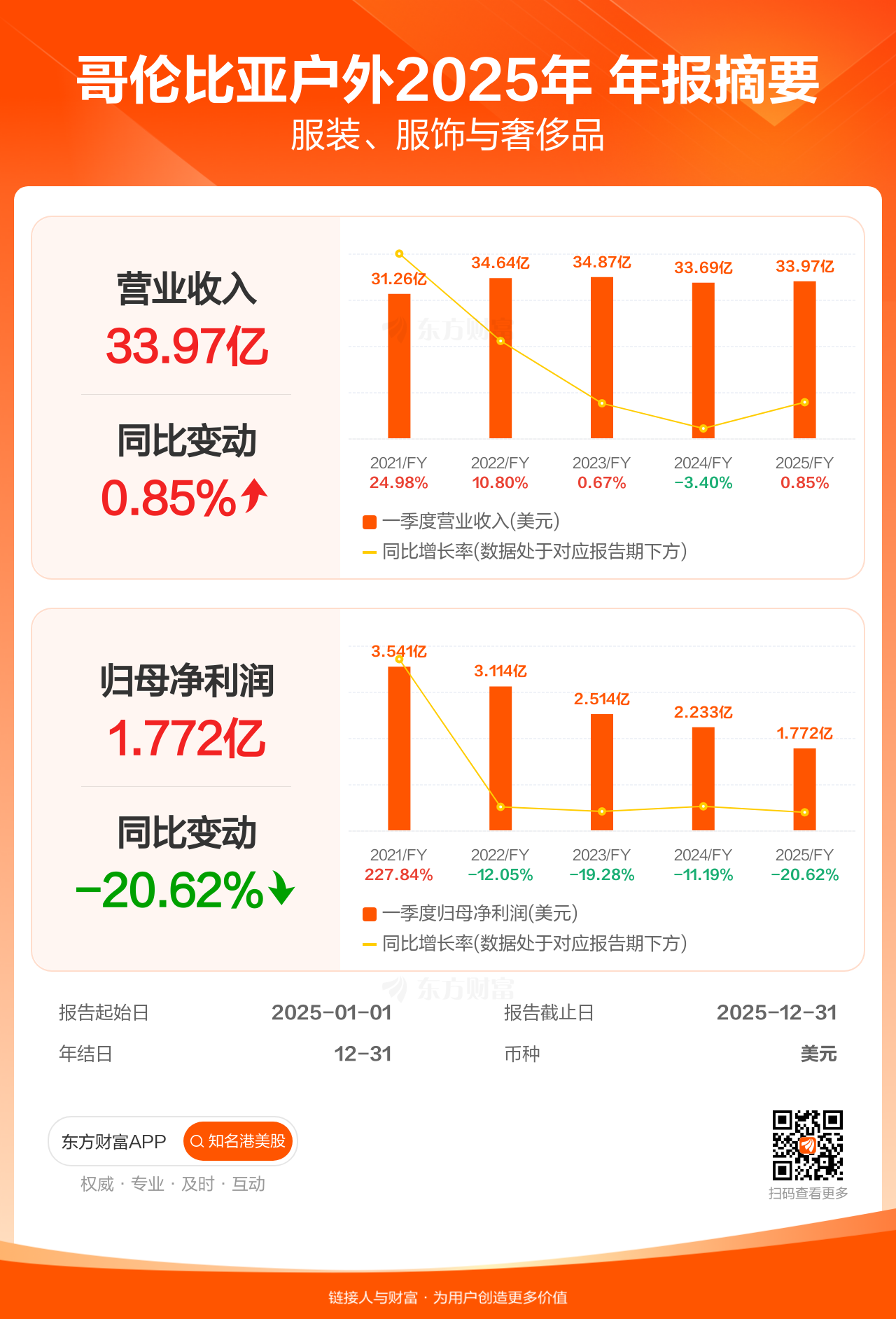 哥伦比亚户外2月3日发布年报业绩,截至2025年12月31日的12个月内,该公司营业收入33.97亿美元,同比增长0.85%;公司权益持有人应占溢利(归母净利润)1.77亿美元,同比减少20.62%。