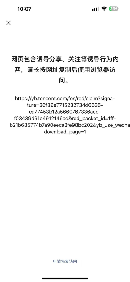2月4日上午9点50分左右,有网友爆料在微信端已经打不开元宝红包,南方财经记者也尝试打开元宝领红包,但是页面显示:“网页包含诱导分享、关注等诱导行为内容,请长按网址复制后使用浏览器访问”。