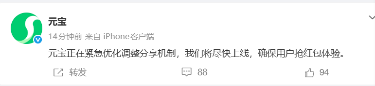 随后,元宝微博发文表示,元宝正在紧急优化调整分享机制,将尽快上线,确保用户抢红包体验。