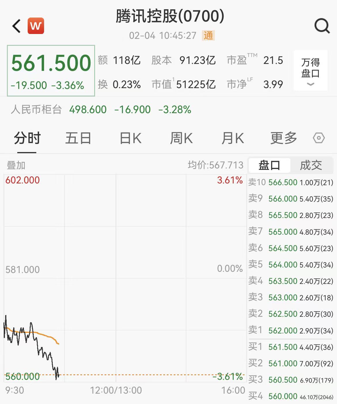 受此消息影响,港股腾讯控股跌幅扩大至3.36%,报561.50港元。