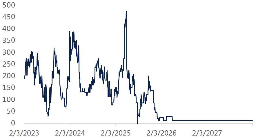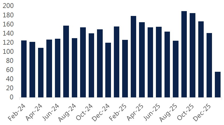 需求侧偏弱,呈现典型的季节性特征。炼厂即将进入春季检修期,原油加工需求边际走弱。另外,海运流量也显示终端拉动不足。据统计,1月25日当周,全球海运原油进口量环比下降5%,亚太地区到港量环比下降11%;中国到港量回落至942万桶/日,1月均值为1089万桶/日,较2025年12月低2%,并可能因船期延后而进一步走弱;欧洲到港量环比下降12%。虽然印度到港量保持强劲,1月预计为549万桶/日,但难以单独对冲检修季带来的边际下行压力,需求低弹性决定了高油价更容易受主动去库存动能不足的约束。