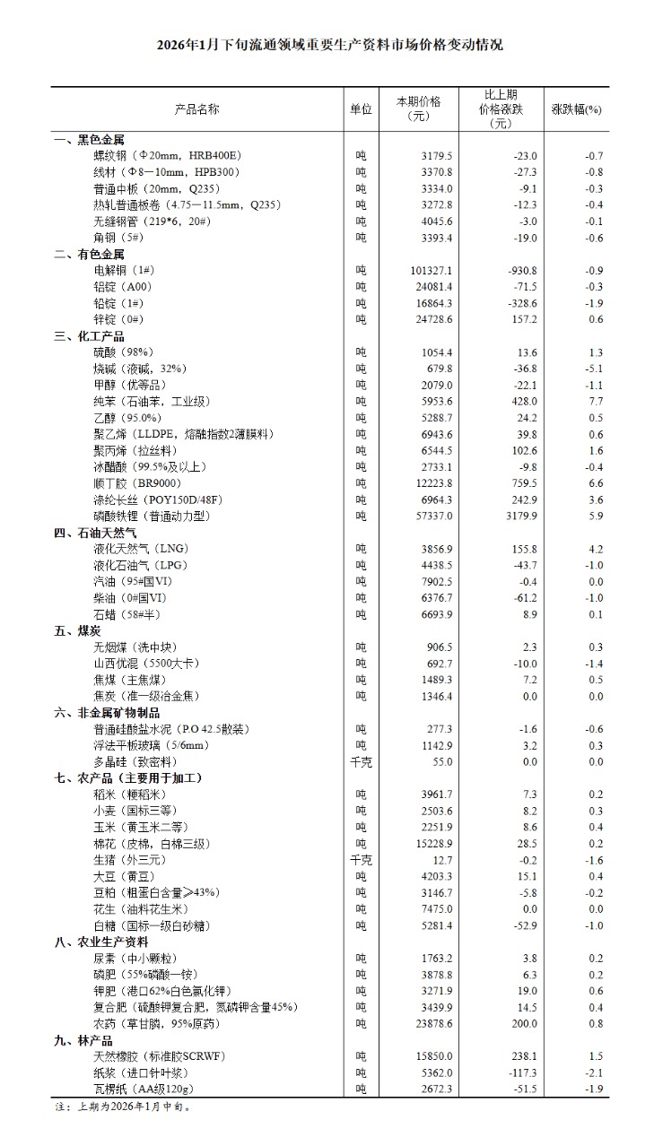 中新网2月4日电据国家统计局网站消息,国家统计局2月4日发布2026年1月下旬流通领域重要生产资料市场价格变动情况。