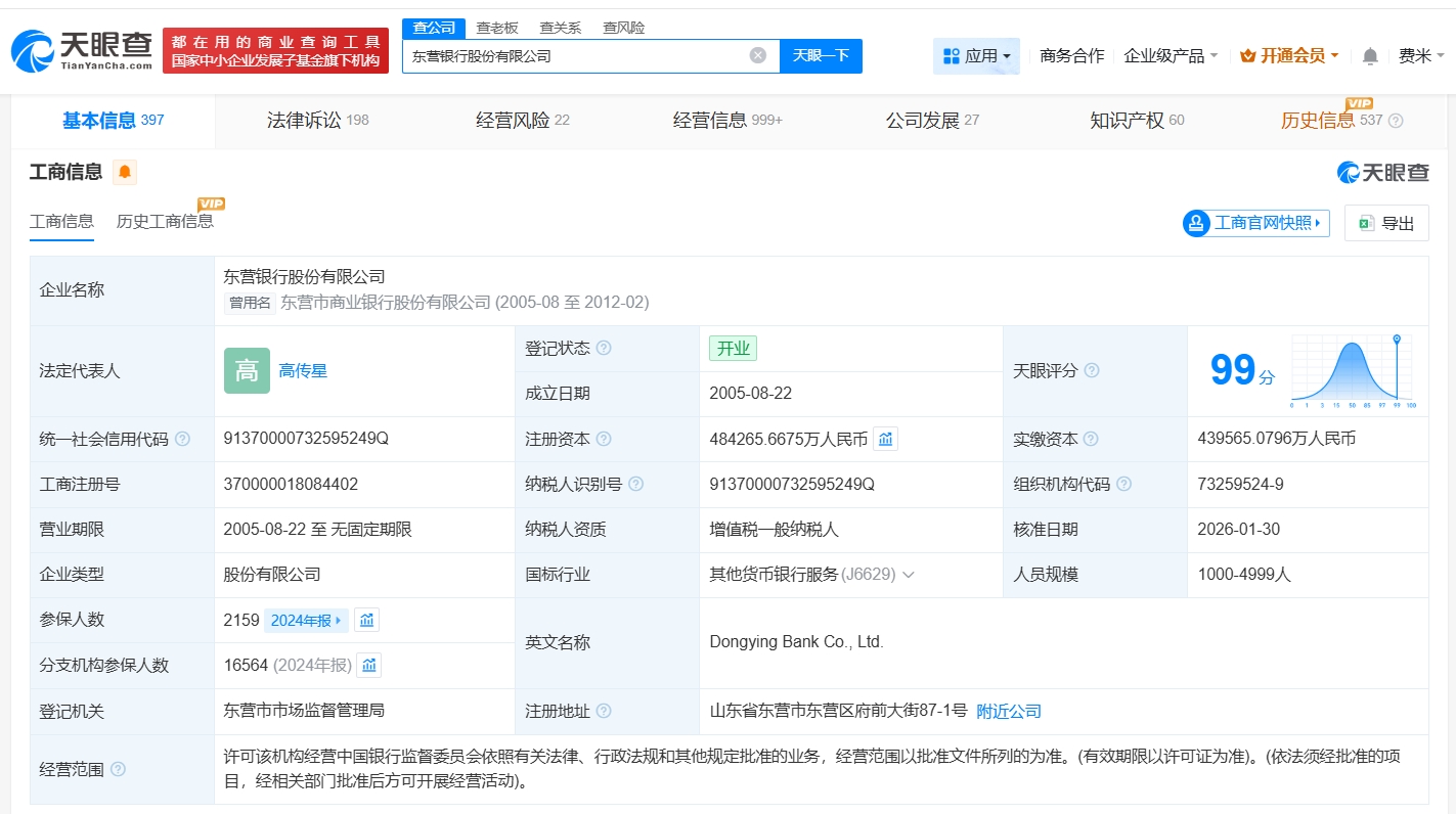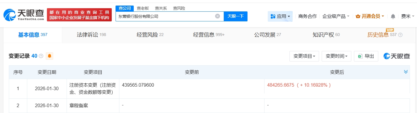 每经AI快讯,天眼查App显示,近日,东营银行股份有限公司发生工商变更,注册资本由约44亿元人民币增至约48.4亿元人民币,增幅约10%。该公司成立于2005年8月,法定代表人为高传星,由东营市财政局、东营区财金投资发展有限责任公司、山东鑫都置业有限公司等共同持股。